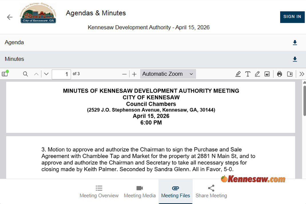 The agreement was formally approved during the April 15, 2026 meeting of the Kennesaw Development Authority. A motion to authorize the purchase and move forward with closing passed with a unanimous 5-0 vote, clearing the path for the deal to proceed.